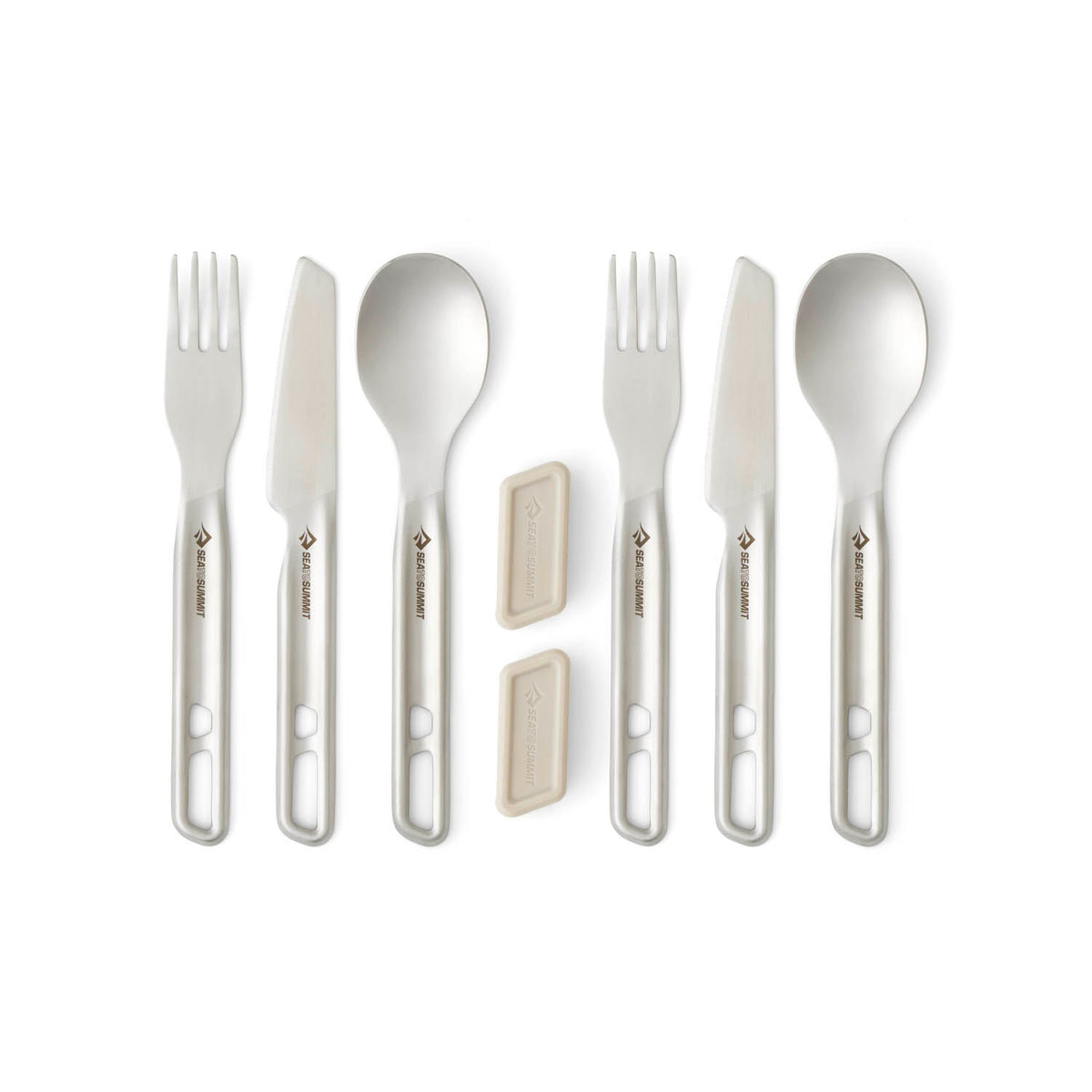 Ergonomically designed and perfectly weighted, the knife, fork and spoon of this two person, 6-piece Detour Stainless Steel Cutlery set is made of high-quality 304 stainless steel. It includes a magnetic silicone rubber keeper that holds each set nested together to prevent sliding and provide rattle-free storage during transport. The spoon and fork are polished on the ends for a more pleasant eating experience and the knife is serrated to cut efficiently and effectively even in the most rugged of locations.