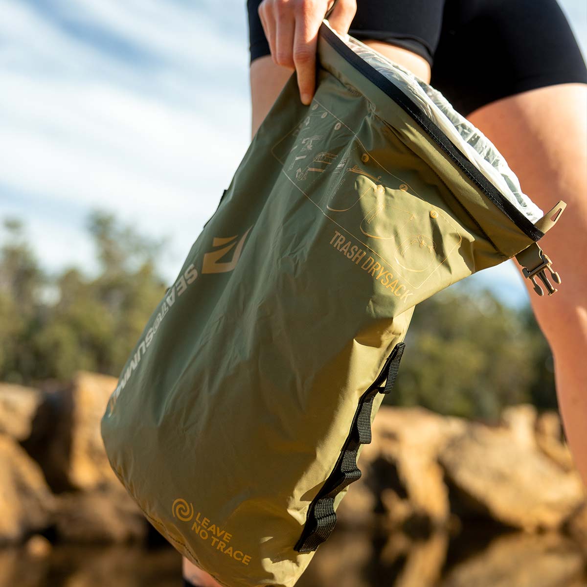 Impacchetta e rimuovi senza problemi. La leggera Trash Dry Bag rende la rimozione dei rifiuti all'aperto semplice e igienica. La chiusura a rotolo e il supporto per il sacco della spazzatura intrappolano in modo sicuro gli odori ed evitano le fuoriuscite. Lo strato esterno è realizzato in nylon 70D impermeabile e riciclato certificato, con cuciture completamente nastrate e doppie cuciture per una maggiore affidabilità. Si adatta a sacchi della spazzatura medi (27 L). Facile da appendere o da legare agli zaini grazie ai punti di aggancio e ai doppi passanti. Progettato per supportare i sette principi del Leave No Trace.